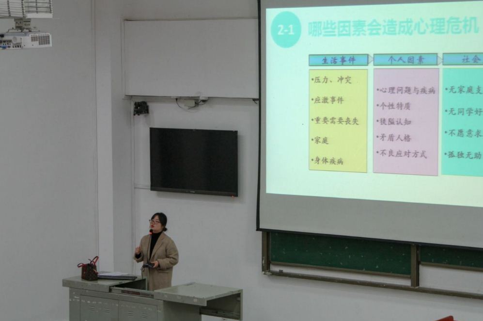 活动开始前,由学生会干事为大家分发小纸条,随后朱老师向大家提问:当你遇到心理危机时,你会联系谁,并让大家在纸条上写下名字。会上,朱老师从什么是心理危机、如何识别心理危机、当我们遇到危机后应当如何处理这三个方面展开讲述,并为同学们提供全方面的心理危机问题的解答,让同学们意识到心理问题的普遍性和可调节性。