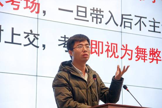 会上,刘老师列举了常见的考试违纪及考试作弊行为及其相应的处分,随后,他宣读了《国家教育考试违规处理办法》和《长江大学学生违纪处分办法》、《长江大学考试工作管理办法》节选内容。刘老师还引用了学校一次性开除23名考试作弊学生的实例,使19级全体新生意识到大学考试与中学考试的不同之处以及诚信考试的重要性。刘少文强调:从2016届开始,因考试违纪给予学生处分的文件归入学生本人的纸质档案。情节特别严重者,处分信息同时在中国高等教育学生信息网学生本人奖惩信息中记载。