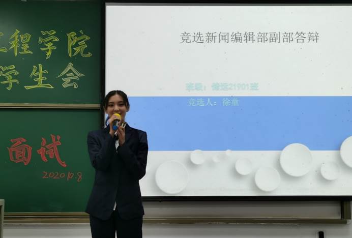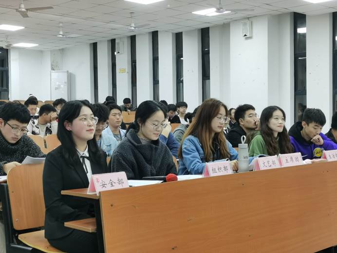 参加面试人员由我院2020级新生组成,他们积极报名并踊跃参与。活动伊始,副主席赵书逸讲解面试会的整个流程和要求,各部门的副部代表就个人简介、竞选优势、工作经验和工作设想等方面进行竞选答辩。他们保持着积极的工作态度,将工作热情在面试场上表现得淋漓尽致。储运21902班高文晴同学在演讲时说道“志在山顶的人,不会贪恋山腰的风景”,积极向上的态度鼓舞了在场的同学们。