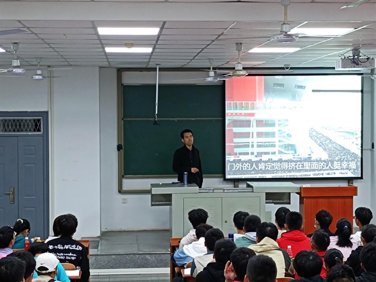 沈伟正老师以严谨而又不失幽默风趣的演讲风格给新生们详细介绍了长江大学的历史文化、地理位置和校友风采等,并从拒绝大学颓废、为何要上大学和如何上好大学等方面展开讲述。沈老师首先提出问题:现在的大学生,他们是怎么样的人呢?非主流?还是乖乖女?之后便解答到:时代变了,这是一个最好的时代同时也是一个最坏的时代,大学生们追求个性,同样也向往优秀,但是也很难抵住诱惑,甚至变得颓废;他列举了学长交我“颓废”,恋爱让我“很累”,上课我要“补觉”,大学学会“加班”,宿舍让我“赖床”,考试让我“信佛”等等误区,并提醒和要求同学们对它们说“不”。母校的文凭、实用的技能、独立的人格和同学的友情,是同学们走向成功的四幅拼图。大学里,寻找学习的乐趣、学会自主独立学习;多读点有益书籍;学会独立生活,让家人放心,这是同学们成为有责任有担当的人才的必经途径。沈老师随后与同学们分享了自己大学时期的照片,有集体活动,师生情谊,同学友情等等,并告诫同学们“一定要珍惜大学时光,玩就好好玩,学就好好学,不留遗憾,青春无悔!”