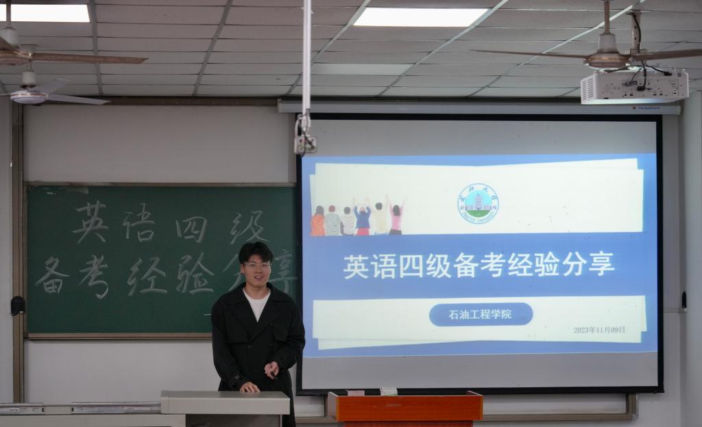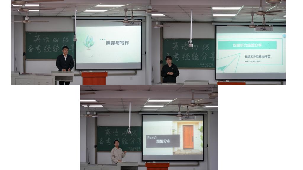 王雪瑶学姐,对四级考试作出全面的概括和科普,分析了四级考试内容,时间分配以及听力、阅读和写作等方面的考试技巧。徐丰苗学姐,结合听力真题范例对不同题型给出了针对性的分析指导和建议。任加怡学姐,为同学们讲解阅读技巧,剖析其题型设置、难度梯度、时间安排等,分享其四级备考宝贵经验。严成杰学长针对四级写作和翻译题型作出经验分享,分析了常见的写作文体与话题,对于考试中的难点词汇,结合实例让同学们体会到用英语思维备考的重要性。
