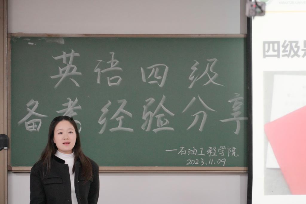 分享会开始,首先由2023级本科生辅导员周雨薇老师进行四级考试动员讲话。她从评优、升学和求职三个方面强调了四级考试的重要性,以及学院对四级通过学生的奖励政策等激发大家对于四级备考的热情。