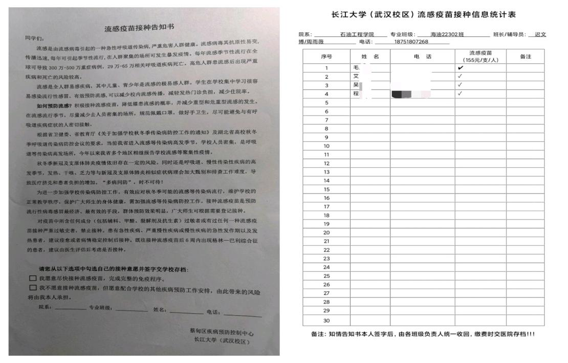 同时,我院组织各班安全员下发“流感疫苗接种”告知书,确保每一位同学知晓并签字,并以班级为单位统计自愿接种流感疫苗学生信息。接种流感疫苗是最有效的预防手段,同学们积极配合学院工作,有效减少了感染流感病毒的风险,对健康校园环境的建设有重要意义。
