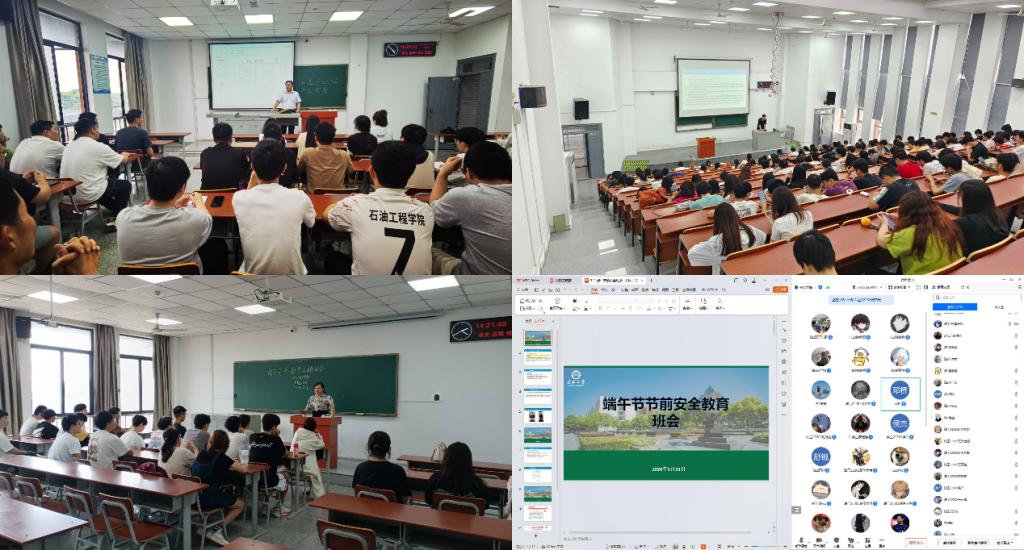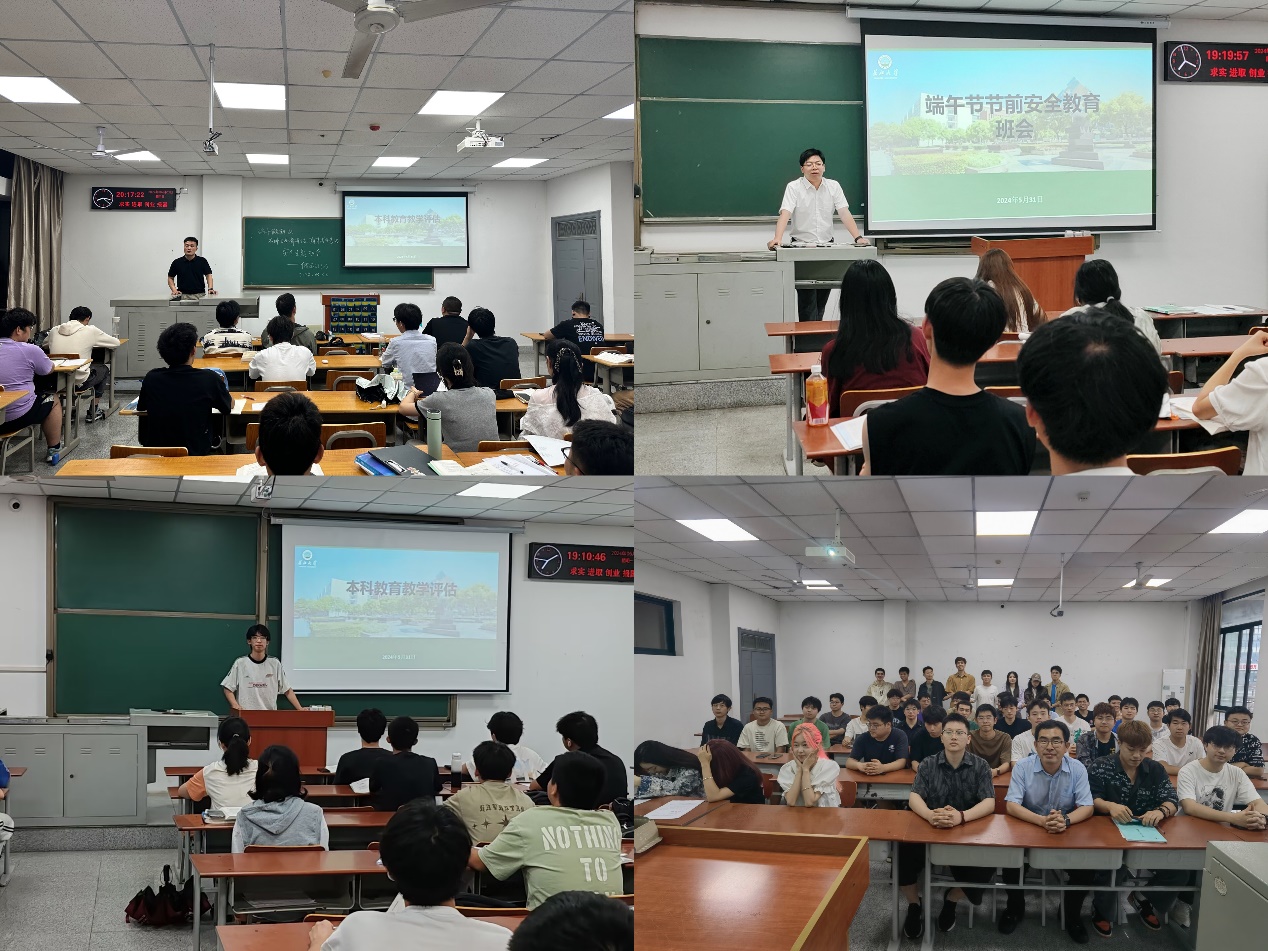 本次主题班会主要从端午节假期的安全教育、本科教育教学评估工作的注意事项以及期末考试考风考纪教育三个方面展开。在此次主题班会上,各班主任讲解了端午节假期外出的注意事项以及学院请销假管理办法,并给同学们讲述防诈骗、防溺水和禁毒等方面的安全教育内容。随后,班主任重申了此次评估工作的重要性以及同学们在此期间需要注意的事项,组织学生学习文明校园创建的倡议书,并向大家强调应注意校园里电动车、自行车的摆放。同时,四六级考试和期末考试临近,班主任向同学们展示了《长江大学学生违纪处分办法》中的相关条例以及反面案例,警示学生在考试中不要作弊,指出对于学习的积累要注重在平时;最后,毕业季即将到来,大四年级的班主任怀着不舍与同学们召开了最后一次班会,并和同学们拍照留念。