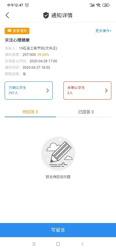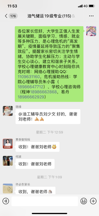 疫情期间,学院推进家校平台的搭建,家校携手保障学生居家安全。各辅导员在家长群、微信公众号平台、各班级群发布《vwin德赢致家长的一封信》,再次提醒家长坚定服从政府在疫情期间的防疫政策,在未得官方通知前,学生不得返校,提醒家长在居家期间要培养良好亲子关系,关注学生身心健康,主动和学生谈心交心,科学理解学生心理情绪,并公开告知家长各年级辅导员联系方式一起学校心理健康教育中心求助方式。学院通过辅导猫以及班级QQ群等形式,对学生开展了心理健康教育工作,鼓励学生科学求助,助力学生在疫情期间化解压力。