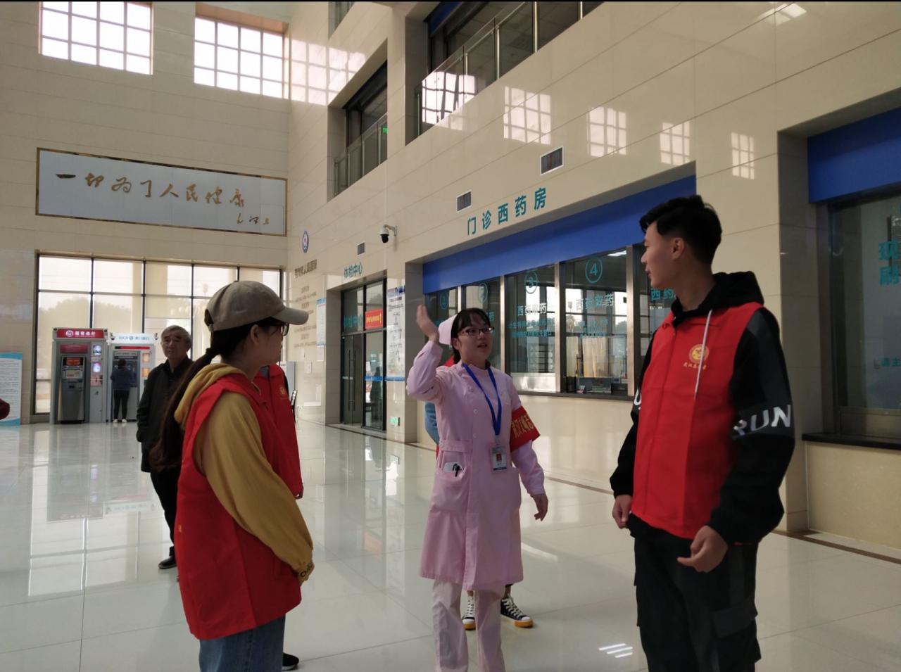 更早的筹备,更好的服务。活动前期由支队的项目负责人根据志愿成员们的无课表对所有的志愿者进行分工与排班,并确定小组长,每次活动由小组长带领参加。9号清晨,轮班的志愿者便在校门口集合,一同出发前往医院。鉴于同学们对医院并不熟悉,医院志愿者负责人姚杪护士长向大家详细介绍了医院的各个功能区块,包括院内全3楼及住院部的相关情况,让志愿者们能够在随后的协助引导中更好地帮助有需要的人。志愿者主要为门急诊患者提供包括导医、导诊、预约诊疗、排队、咨询、解释、护送、取药、陪同检查、取送检查检验报告单、费用查询、健康教育、投诉等服务;为输液病人送开水、发放医院宣传资料,协助医护人员为无家属陪同的输液病人做简易的生活护理;与行动不便且无人陪伴的老人沟通交流并由志愿者陪同办理一系列相关手续;协助医院工作人员维持秩序,保证医院安静的环境。