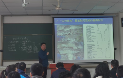 高达老师公开示范课分为两部分:一是他多年备赛参赛经验交流与分享,以“分享-探讨-进步”为主线,从长江大学青年教师教学竞赛细则入手,分享了自己的参赛经验;二是模拟比赛课程讲授,以《岩相古地理》曲流河沉积模式为参赛节段,进行了完整的赛程示范。高达博士的示范课深入浅出,将最新的科研成果融入课堂教学,授课过程采用PPT与板书结合,既有文字表达、又有图片和视频播放,使得整个教学过程生动有趣,通过现场积极与学生互动,让学生对该课程产生了浓厚的兴趣。最后高达博士的讲课在热烈的掌声中落下帷幕,吸引了我院多名年轻教师现场积极互动与交流。