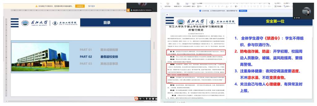 明确返校节点,做好行程规划。班会上,班主任对学业和返校事项作出系统安排,提醒同学们认真核查上学期成绩及学分获取情况,及时关注补考安排并做好复习准备。同时,会议明确了老生与新生的报到时间,要求学生合理安排行程、提前购票,严格按时返校。通过系统讲解和互动答疑,同学们进一步明确了返校流程和时间节点,显著提高了对新学期注册报到安排的认知度和配合度,有效避免了因信息不清导致的延迟返校情况。