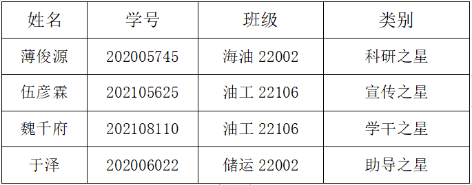 根据学院《关于vwin德赢评选2023年“油院之星”的通知》,经学生个人申请、评委团初评、学院会评,拟确定选薄俊源等四名学生获评2023年“油院之星”奖学金。现将评审结果进行公示: