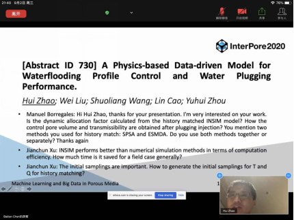 8月31日-9月4日,国际多孔介质协会(International Society for Porous Media)第12届全球年会(Interpore 2020)在线上举办。该会议国际多孔介质协会主办,中国石油大学(华东)承办。我院赵辉教授受邀参加会议并担任大会分会场主持人。会上,赵辉教授发表题为“A Physics-based Data-driven Model for Waterflooding Profile Control and Water Plugging Performance”的大会报告,引发与会专家的热烈讨论与好评。近年来,赵辉教授团队的研究成果在智能油气藏领域的影响日益深入,受到了国际同行的高度关注与认可。本届大会上,挪威SINTEF公司Manuel Borregales等人的大会报告中将其创立的数据驱动模拟模型(INSIM)引入到目前世界石油领域著名的开源油藏数值模拟仿真软件MATLAB Reservoir Simulation Toolbox(MRST)中,该软件被国内外广大石油高校和石油公司广泛采用,用于教学、科研和快速原型开发研究。