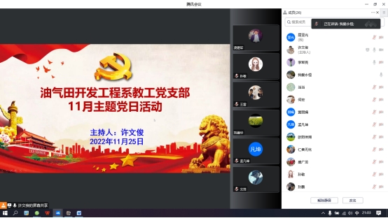 (通讯员 屈亚光)为学习贯彻党的二十大精神,结合当前疫情防控实际情况,11月25日晚9点,油气田开发工程系教工党支部通过腾讯会议方式召开了11月主题党日活动,由支部书记许文俊同志主持。
