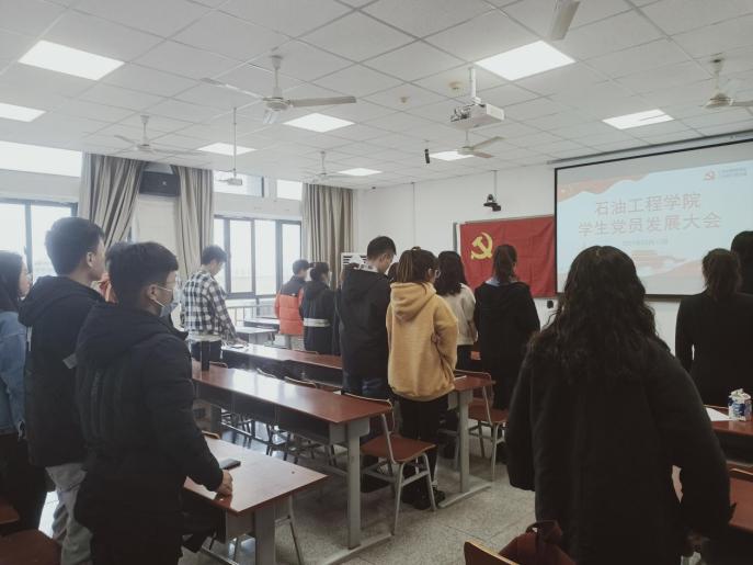 大会伊始,全体起立奏唱国际歌。其后,张欣、曾思佳两名发展对象逐一走上台面对党旗进行庄严的入党宣誓,并向党组织全面深刻地剖析自己的优缺点及未来改进的方向。通过平常的了解表达自己的意见,两位入党介绍人向与会人员介绍了该同学的思想政治和学习生活情况。接着,由支委向与会人员宣读其政治审查情况。该名同学入党情况需要大会进行统一的讨论,许多同志对本次的拟发展对象指出了其存在的问题并对他们日后的工作与学习提出了建议并给予了殷切的期望。