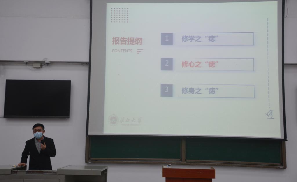 从电影《大话西游》中至尊宝遇上那个给他三颗痣的人就有了无穷的力量出发,魏老师表示也想给同学们的心中点上修学、修心、修身三颗痣,让同学们走好大学之路。点亮修学之“痣”——读书可以启智。“竞争内卷激烈就读书,读书可以破万‘卷’”,魏老师以此教导同学们,想要成为人才必须付出更多的努力。还用详细的数据图表分析了油田中学历越高越有利于个人发展的现状,以自身经历勉励同学们读书深造。腹有诗书气自华,魏老师希望同学们能够通过读书提升自己的气质,成就更好的自己。点亮修心之“痣”——良好的心态是持续发展的基础。机会是留给有准备的人的,但真正的机会不可预期,魏老师教导同学们要默默努力、慢慢积累。无用之用,方为大用,魏老师用自己的亲身经历说明,当下似乎看不到回报的认真付出与投入,可能会在将来的某个瞬间为你打开一扇惊喜的大门,希望同学们能摆正自己的心态。正如以前觉得读马哲没用,但读过之后发现,马哲可以提高逻辑思维能力,为之后写材料写论文打下基础。点亮修身之“痣”——身体是革命的本钱。魏老师提醒同学们要坚持有规律的运动,保证合理的营养摄入,保证充足的睡眠时间。