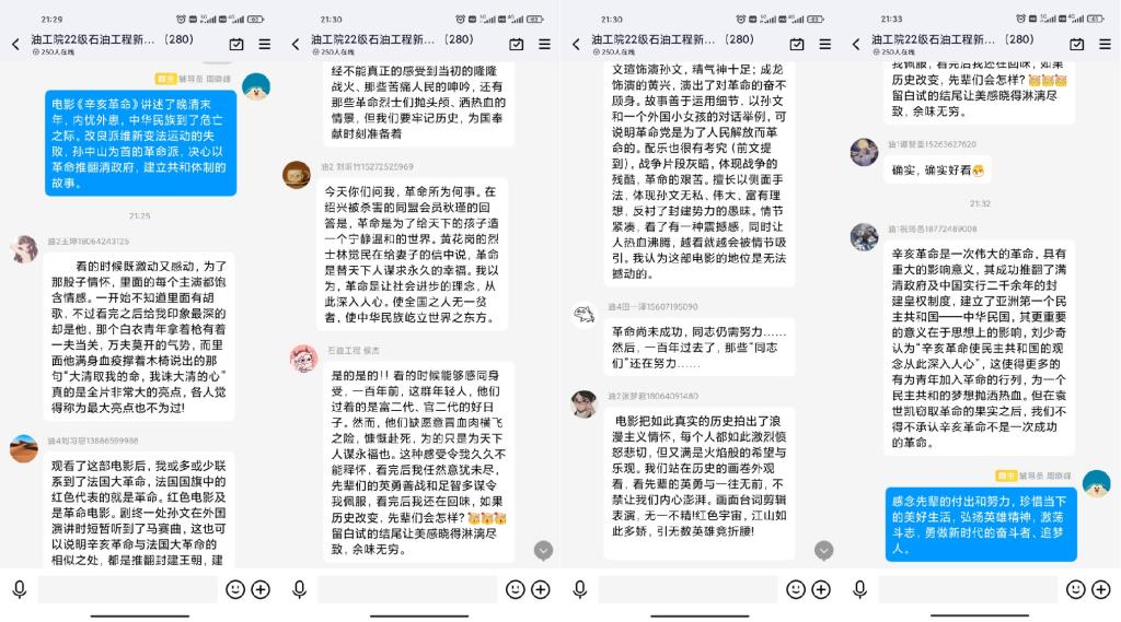 电影引发了同学们的思考,他们纷纷在群里分享感悟。油工22202班侯杰同学写道,“一百年前,这群年轻人,他们过着的是富二代、官二代的好日子。然而,他们却愿意冒血肉横飞之险,慷慨赴死,为的只是为天下人谋永福也。这种感受令我久久不能释怀,看完电影仍感觉意犹未尽。”许多同学表示,当天晚上就要撰写《入党申请书》。