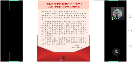 首先由学习小组对《回信》内容及精神内涵进行了集中学习与讨论,大家充分感受到来自习近平总书记对高校毕业生的殷切希望。同时结合校友王骏的成长与发展心路历程,大家一致认为去西部、去基层将大有所为,进一步坚定了为祖国石油事业献身的信念,并表示将带着学习收获回到各班,开展广泛而深入的学习。